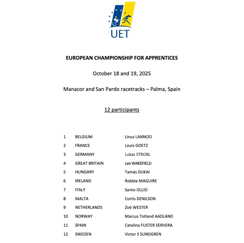Obwohl Lukas Strobl bereits Ende Juni seine Abschlussprüfung zum Berufsfahrer ablegte, erfüllt er die Teilnahmebedingungen der UET (Union Européenne du Trot). Danach müssen sich die insgesamt zwölf Teilnehmer zu Beginn des EM-Jahres noch in Ausbildung befunden haben.
